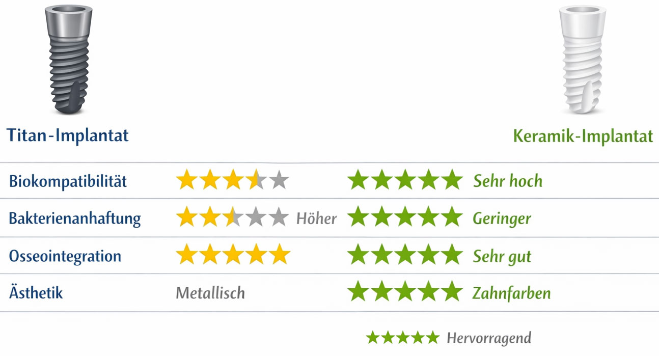 Keramikimplantate bieten besondere Vorteile und eignen sich vor allem für Patienten mit hohen ästhetischen Ansprüchen oder dem Wunsch nach einer metallfreien Versorgung: